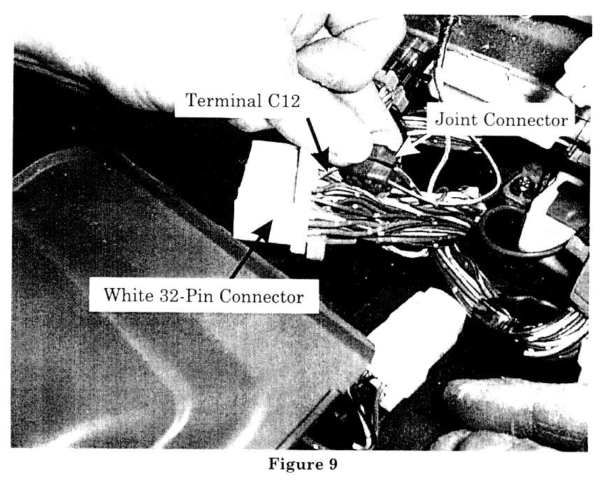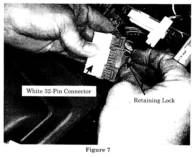 9. Disconnect the white 32-pin connector from the back of the PCM and remove its grey retaining lock (figure 7). Locate the red/white stripe wire connected to terminal C12 of the white 32-pin connector.