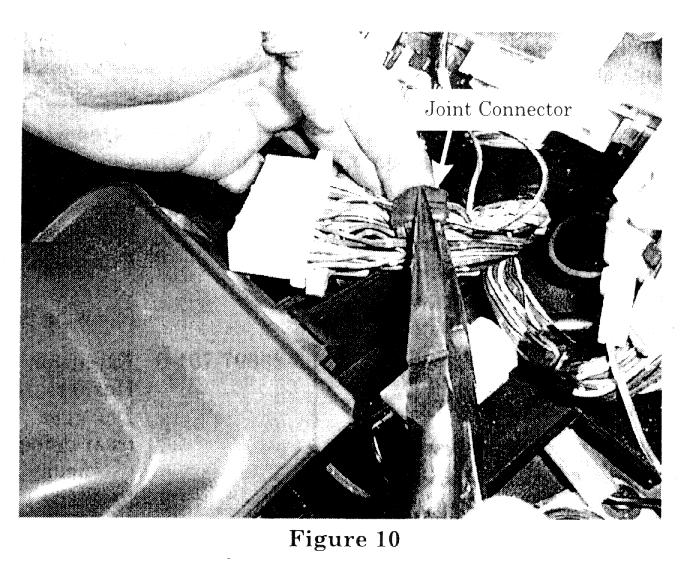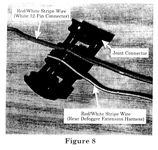 10. Set the red/white stripe wire of the white 32-pin connector into the trough of the red plastic joint connector, supplied from the kit. Set the red/white stripe wire of the rear defogger extension harness into the remaining trough of the joint connector (figure 8).