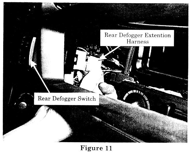 14. Install the new rear defogger switch, supplied from the kit, into the opening in the meter cluster assembly. Connect the grey 5-pin female connector of the rear defogger extension harness into the green 5-pin male connector on the back of the new rear defogger switch (figure 11).