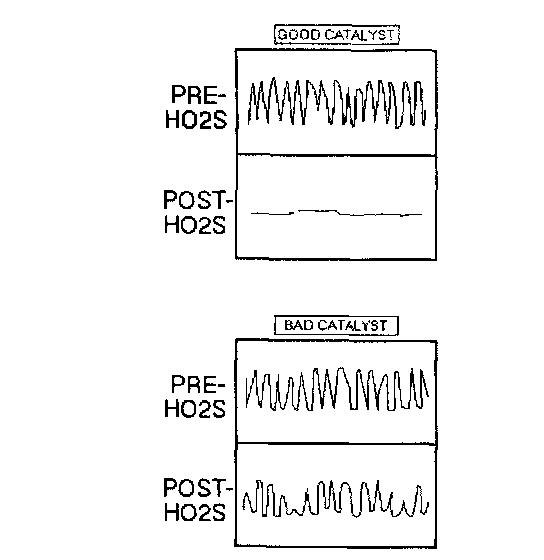 The Three-Way catalyst (TWC) must be monitored for efficiency. To accomplish this, the control module monitors the pre-catalyst HO2S and post-catalyst H025 oxygen sensors. When the TWC is operating properly, the post-catalyst oxygen sensor will have significantly less activity than the pre-catalyst oxygen sensor. The TWC stores and releases oxygen as needed during its normal reduction and oxidation process. The control module will calculate the oxygen storage capacity using the difference between the pre-catalyst and post catalyst oxygen sensor's voltage levels. It the activity of the post-catalyst oxygen sensor approaches that of the pre-catalyst oxygen sensor, the catalyst's efficiency is degraded.