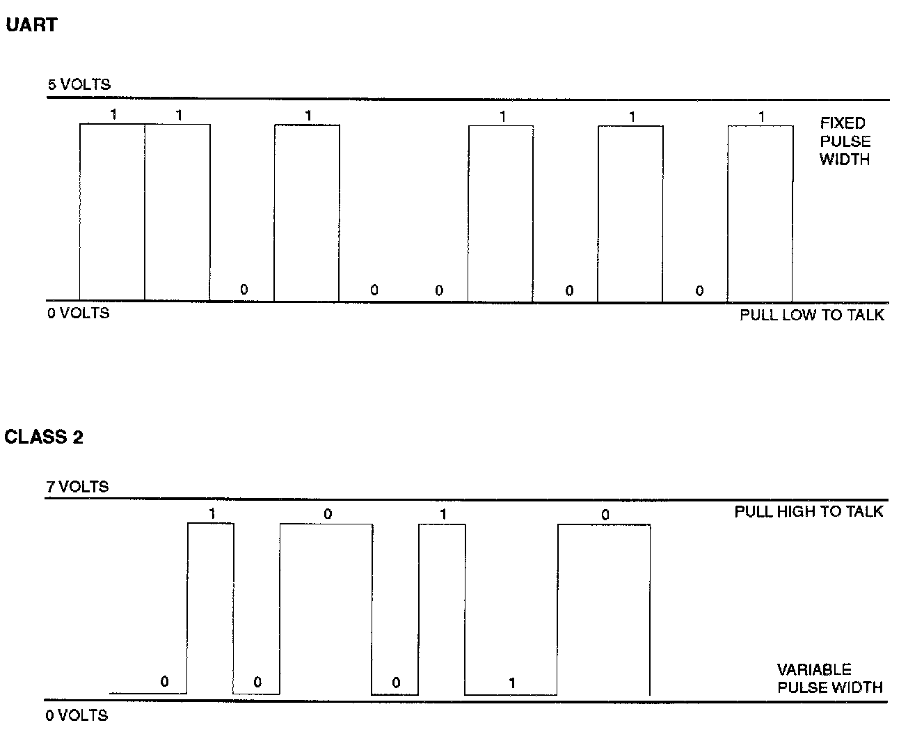 Class 2 data is also pulse width modulated. Each bit of information can have one of two lengths: long or short. On the other hand, ART data bits come in only one length (short). The pulse width modulation of Class 2 data allows better utilization of the data line.