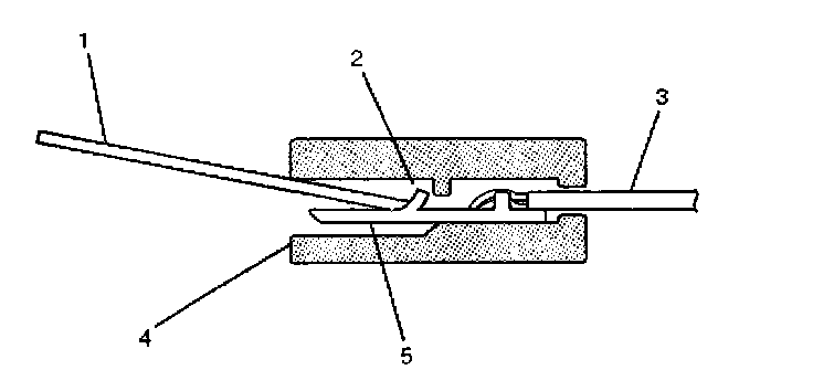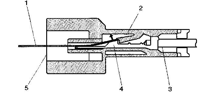 2. Push the tang lock (2) flat (toward the wire (3) side of the connector. Pull the wire with pin (4) free from the wire side of the connector.