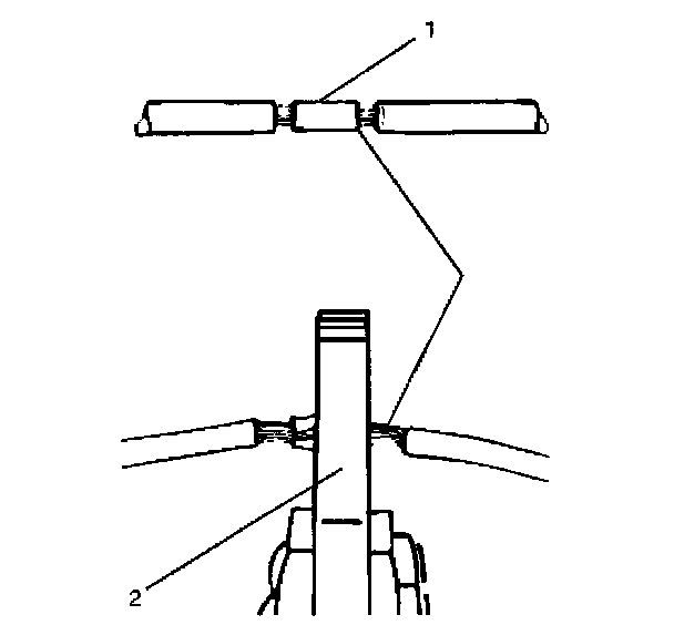 4. Position the wiring harness with enough clearance from the other parts and guard the wiring harness with a vinyl tube (2) and clips (1) to avoid direct contact.