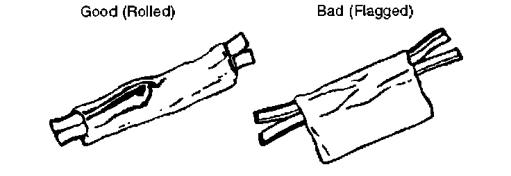 Does not flag the tape. Flagged tape may not provide enough insulation, and the flagged ends will tangle with the other wires in the harness as shown in the figure.