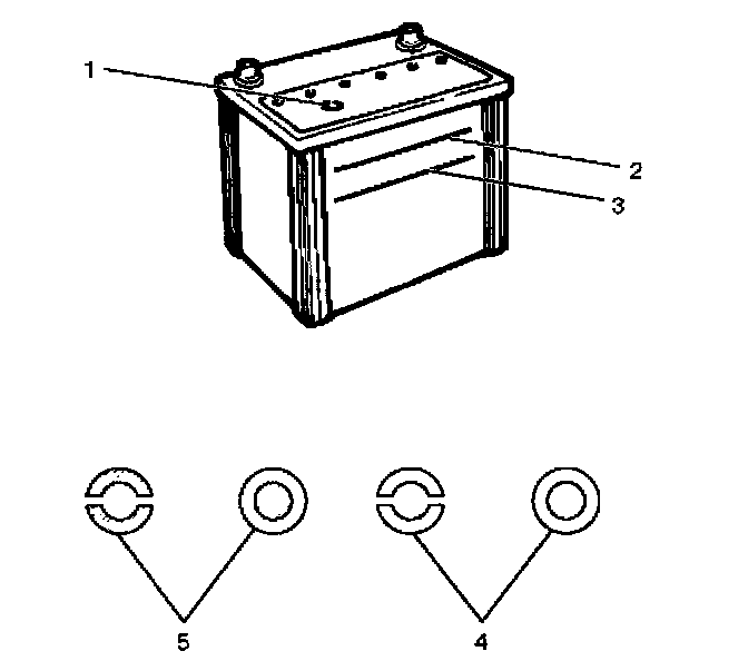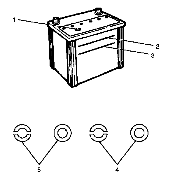 The fluid level should be between the upper level line (2) and lower level line (3) on side of battery.