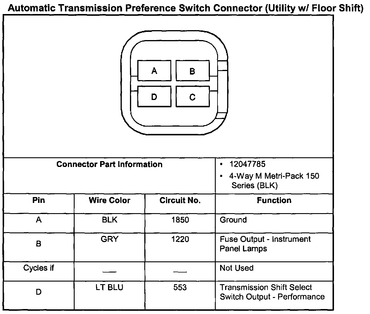 Automatic Transmission Preference Switch Connector (Utility W/ Floor Shift)