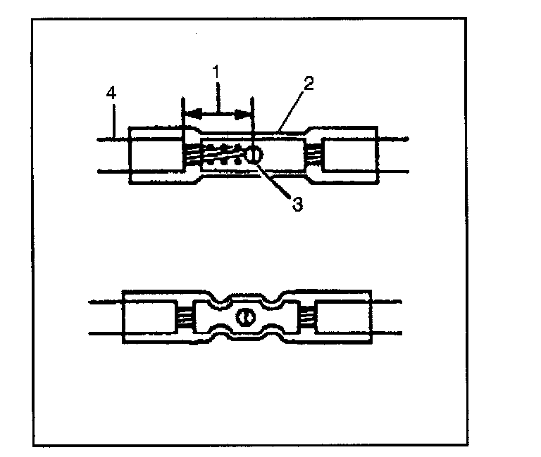 - Strip approximately 7.5 mm (5/16 inches) of insulation from each wire to be spliced (1).