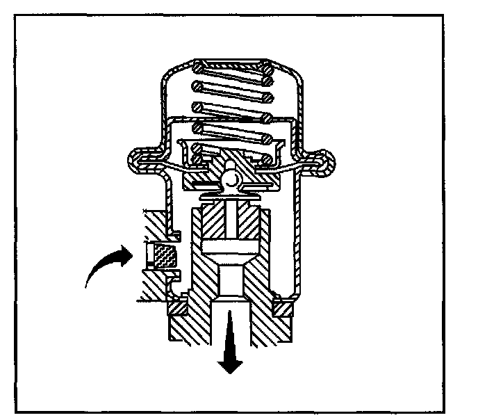 The fuel pressure regulator assembly is a diaphragm-operated relief valve with fuel pump pressure on one side, and a regulator spring pressure and intake manifold vacuum on the other side. The regulator's function is to maintain a constant pressure differential across the injectors at all times. The pressure regulator compensates for engine load by increasing the fuel pressure as the engine vacuum drops. The fuel pressure regulator is serviced as a complete assembly. With the ignition ON and engine OFF (zero vacuum), fuel pressure should be 284 - 325 kPa (41 - 47 psi). Whenever the pressure is too low, poor performance and a DTC P0171 could result. Whenever the pressure is too high, excessive odor and a DTC P0172 could result.