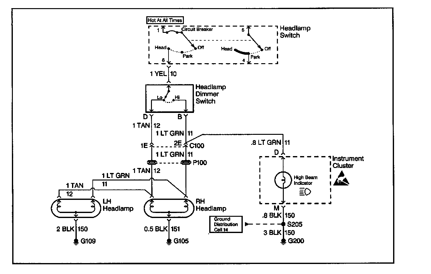 At this point analyze and (diagnose the problem), and develop text. Since the high beam indicator illuminated when the headlamp dimmer switch was in the high position, the high contacts of the headlamp dimmer switch and the LT GRN wire between the headlamp dimmer switch and C100 are good.