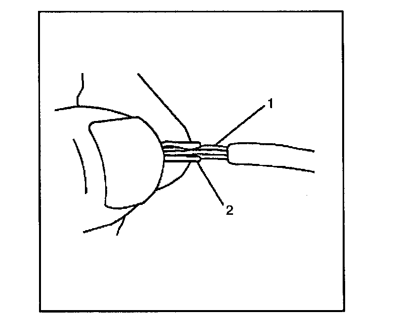 6. Overlap the two stripped wire ends and hold them between thumb and forefinger.