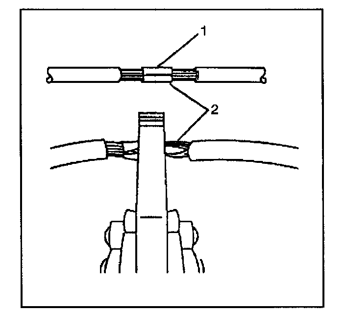 7. Center the splice clip (2) over the stripped wires (1) and hold the clip in place.