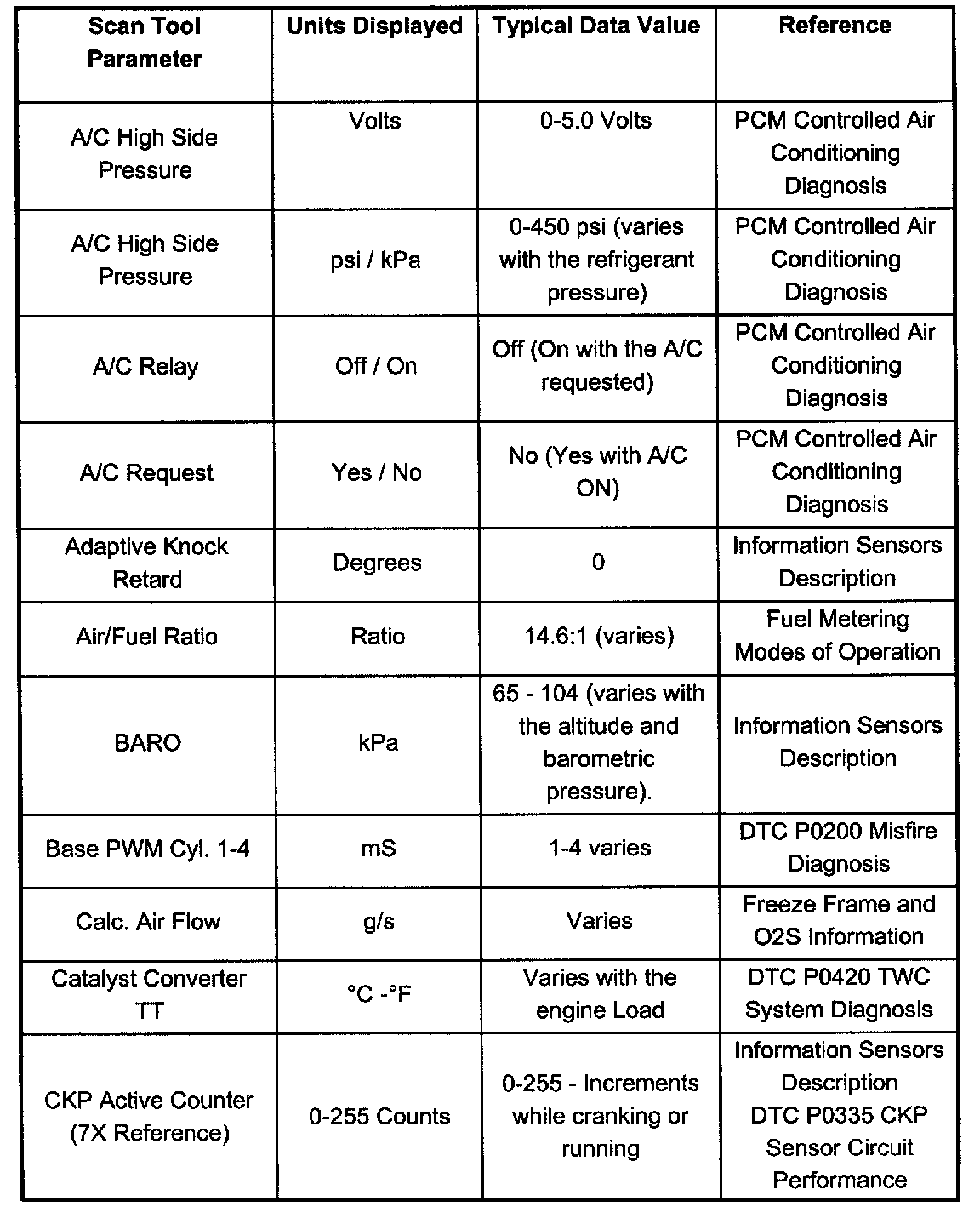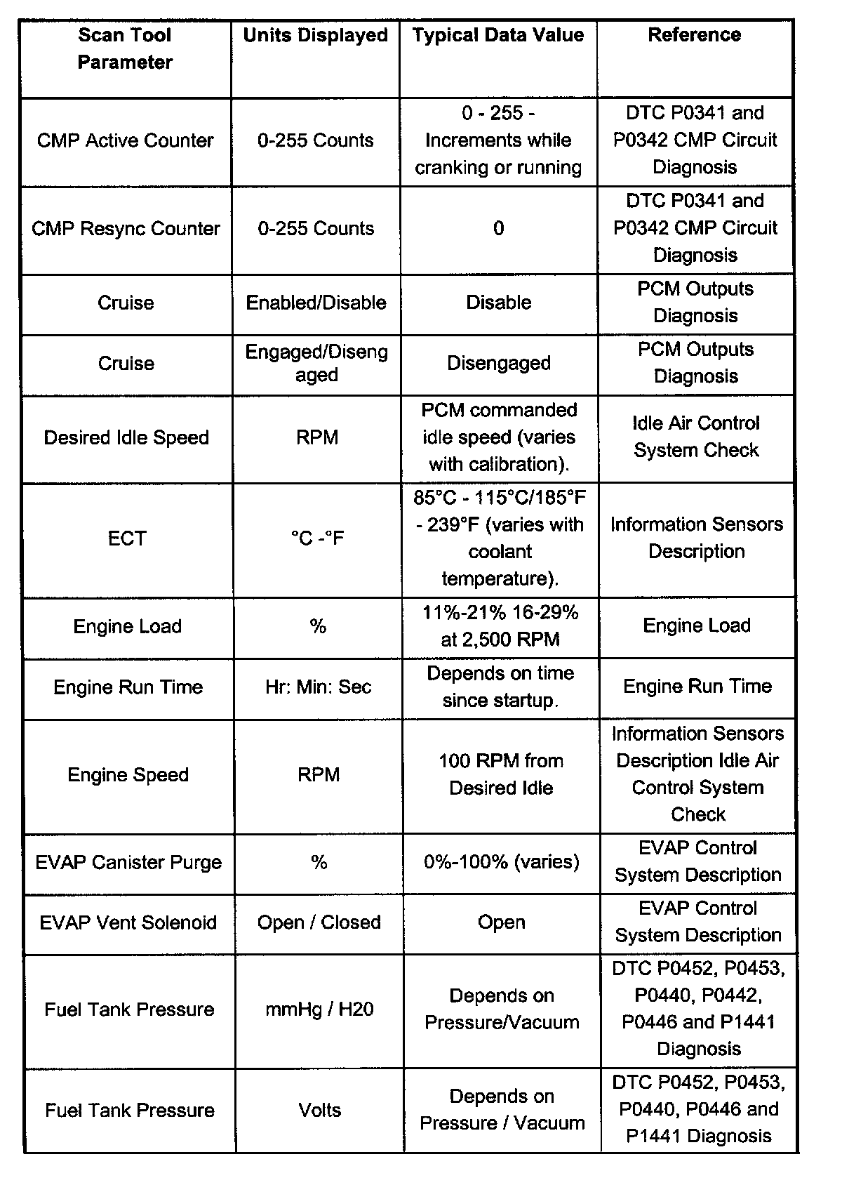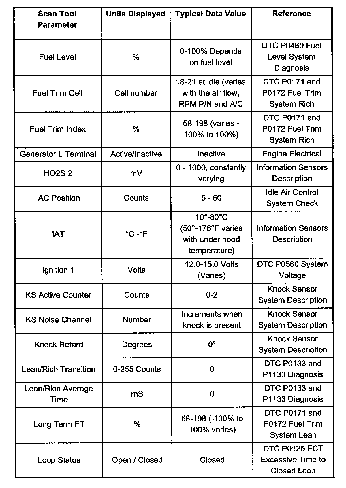 Only the parameters listed are used for diagnosis. If a scan tool reads other parameters, General Motors does not recommend these values for use in the diagnosis. For more description on the values and use of the scan tool to diagnose the PCM inputs, refer to the applicable diagnostic procedure. If all of the values are within the illustrated ranges, refer to Symptoms.