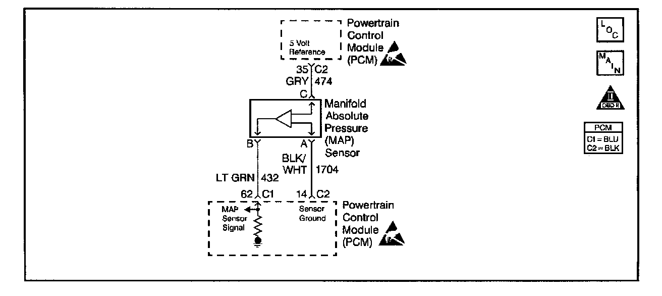 The Manifold Absolute Pressure (MAP) sensor measures the changes in the intake manifold pressure which result from the engine load (intake manifold vacuum) and the RPM changes then converts these into a voltage output. The Powertrain Control Module (PCM) supplies a 5 volt reference voltage to the MAP sensor. As the manifold pressure changes, the output voltage of the sensor also changes. By monitoring the sensor output voltage, the PCM knows the manifold pressure. A lower pressure (low voltage) output voltage will be about 1.0 to 1.5 volts at idle. While high pressure (high voltage) output voltage will be about 4.5 to 4.8 volts at Wide Open Throttle (WOT). The MAP sensor is also used, under certain conditions, to measure barometric pressure, allowing the PCM to make adjustment for different altitudes. The PCM uses the MAP sensor in order to control the fuel delivery and the ignition timing.