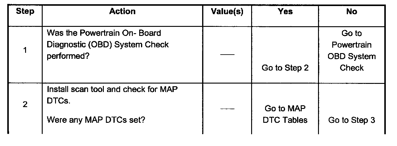 4. Applying 34 kPa (10 in of Hg) vacuum to the MAP sensor should cause the voltage to be 1.5 to 2.1 volts less than the voltage at Step 3. Upon applying vacuum to the sensor, the change in voltage should be instantaneous. A slow voltage change indicates a malfunctioning sensor.