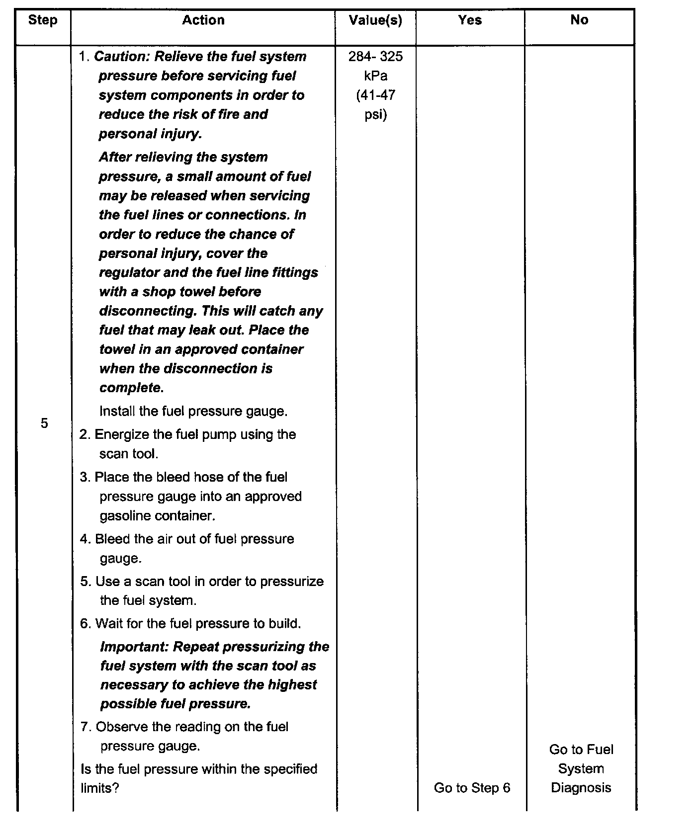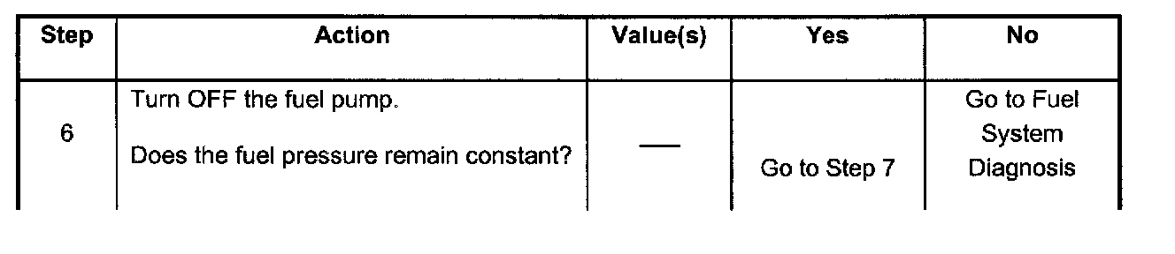 6. The Fuel pressure should reach a steady value. If the fuel pressure does not reach a steady value, refer to Fuel System Diagnosis.