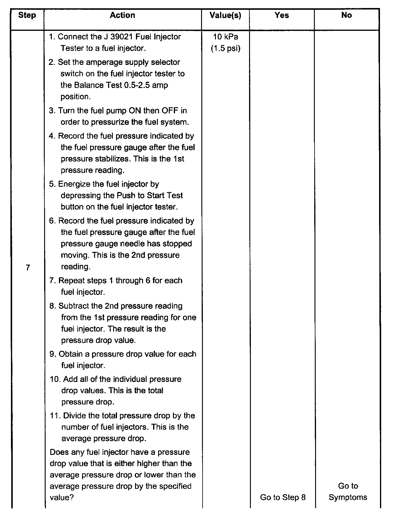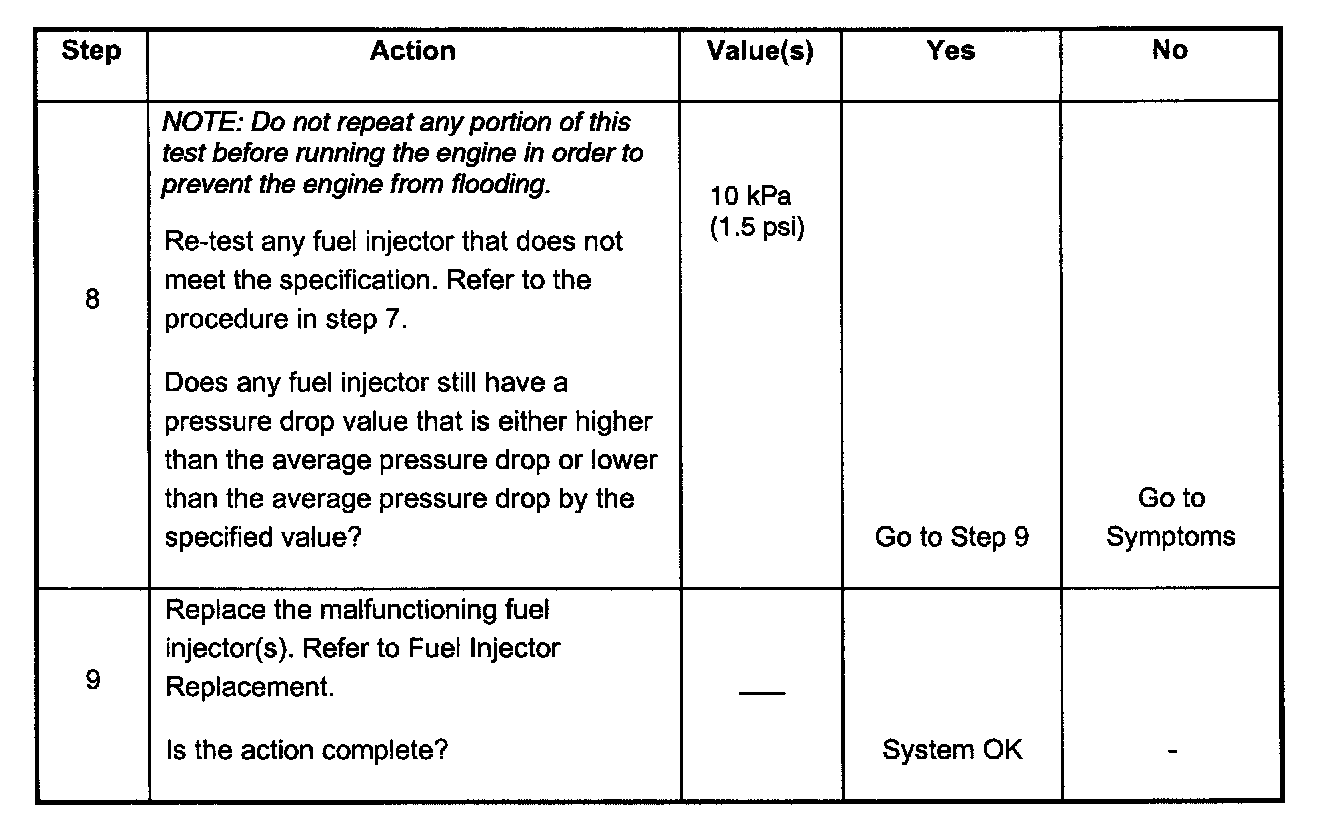 7. If the pressure drop value for each fuel injector is within 10 kPa (1.5 psi) of the average pressure drop value, the fuel injectors are following properly. Calculate the pressure drop value for each fuel injector by subtracting the second pressure reading from the first pressure reading. Refer to the illustration above.