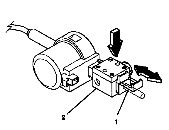 2. Press on the adjuster block (2) to compress the internal adjuster spring to disengage the adjuster teeth. Slide the adjuster block (2)as far away from the solenoid as possible.