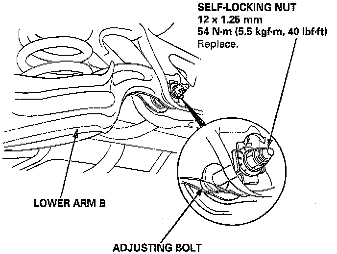 10. Hold the adjusting bolt on the rear lower arm B and loosen the self-locking nut.
