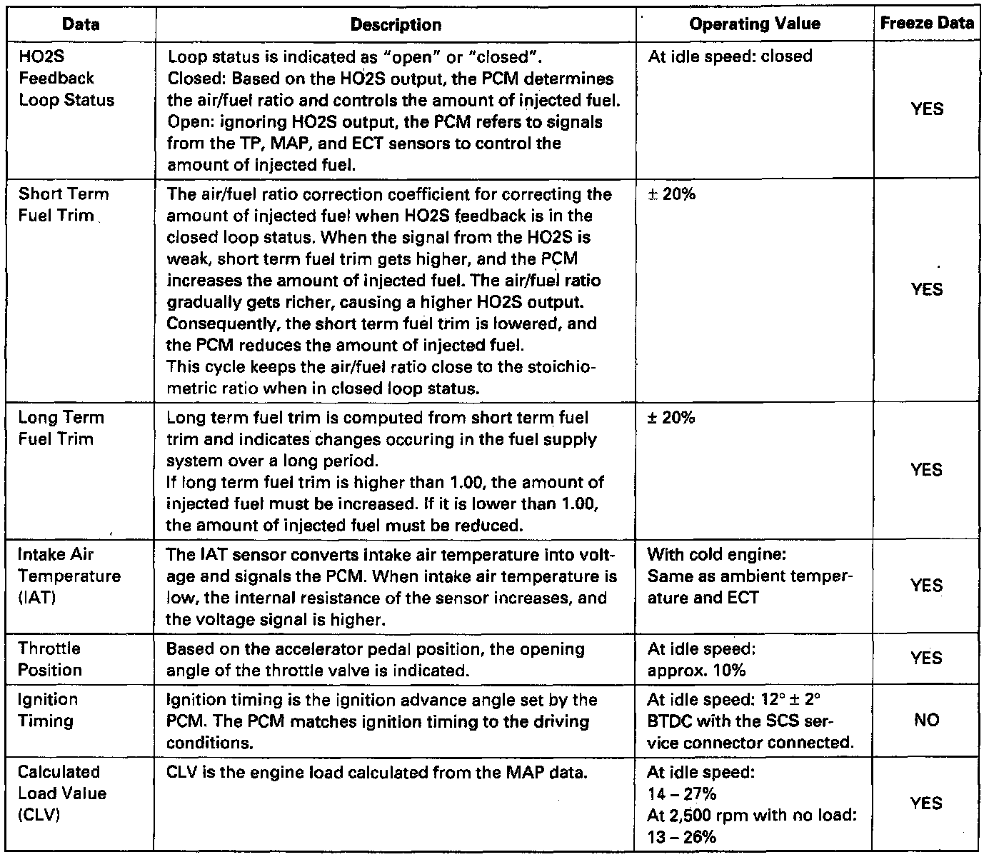 - The "operating values" given below are approximate values and may be different depending on the environment and the individual vehicle.