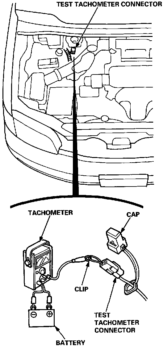 1. Start the engine. Hold the engine at 3,000 rpm with no load (shift lever in [N] or [P] position until the radiator fan comes ON, then let it idle.2. Connect a tachometer to the test tachometer connector.