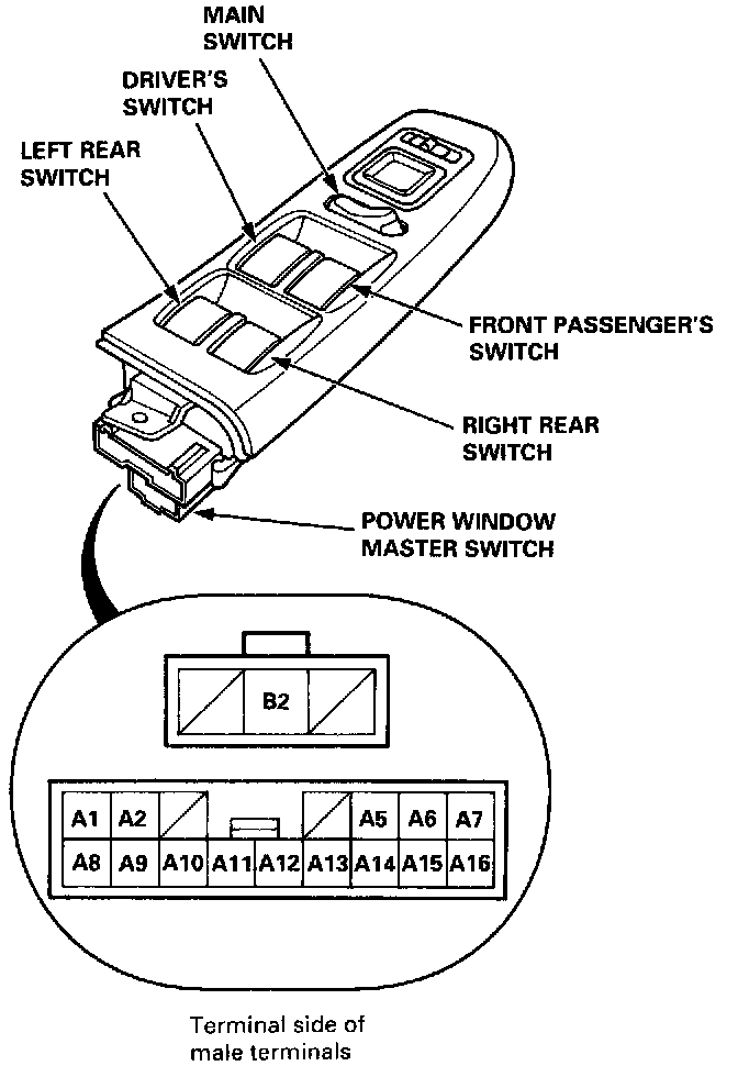 The driver's switch is combined with the control unit so you cannot isolate the switch to test it. Instead, run the master switch input test procedures at terminals A1, A2, A5, A6, A7, A8, A14, A16, and B2. If the tests are normal, the driver's switch must be faulty.