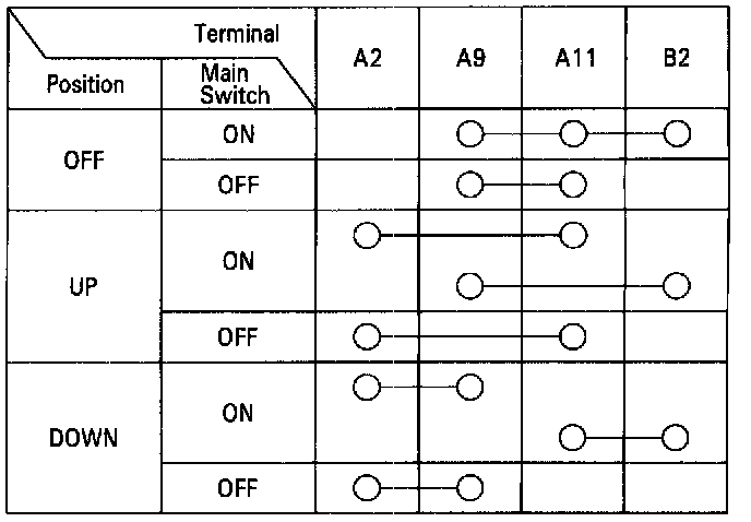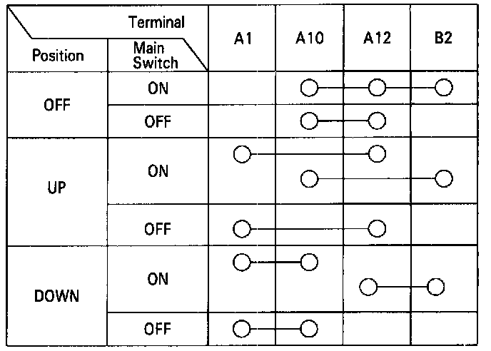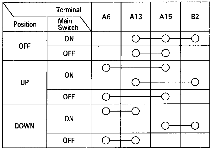 1. Remove the master switch.2. Check for continuity between the terminals in each switch position according to the tables.