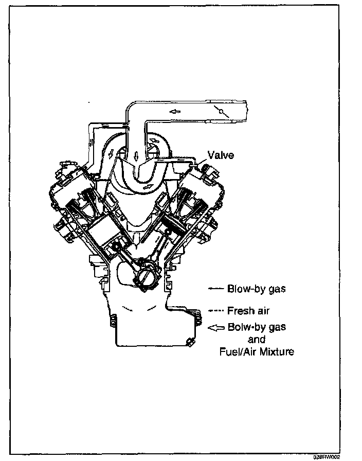 Crankcase Ventilation System Purpose/OperationThe crankcase ventilation system is use to consume crankcase vapors in the combustion process instead of venting them to the atmosphere. Fresh air from the throttle body is supplied to the crankcase and mixed with blow-by gases. This mixture is then passed through the positive crankcase ventilation (PCV) valve into the common chamber.