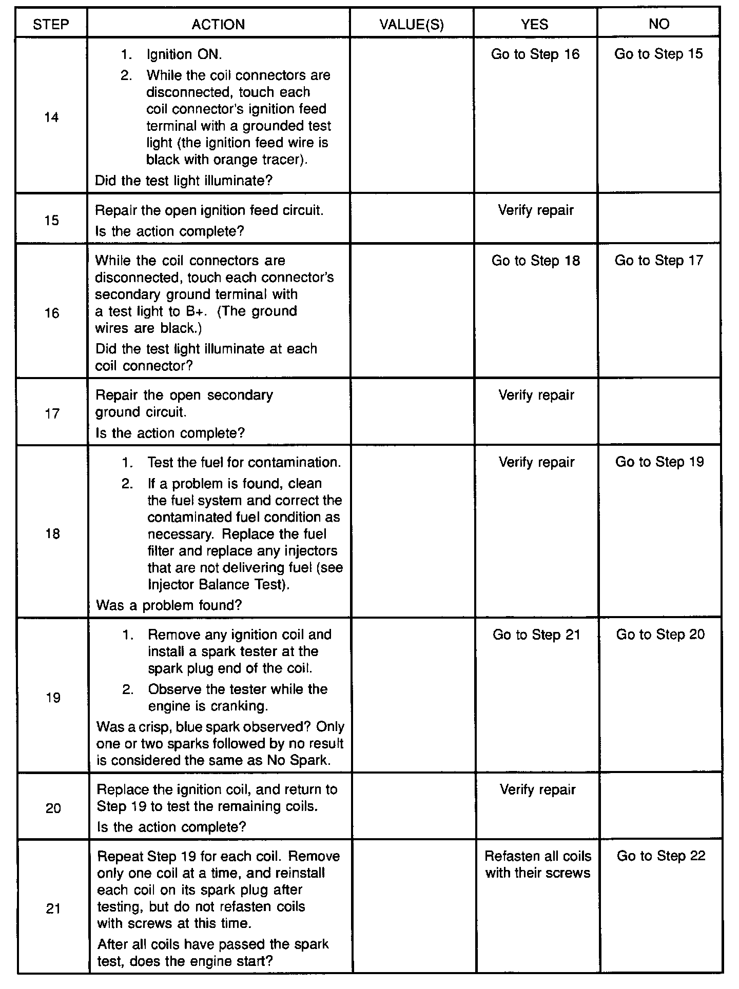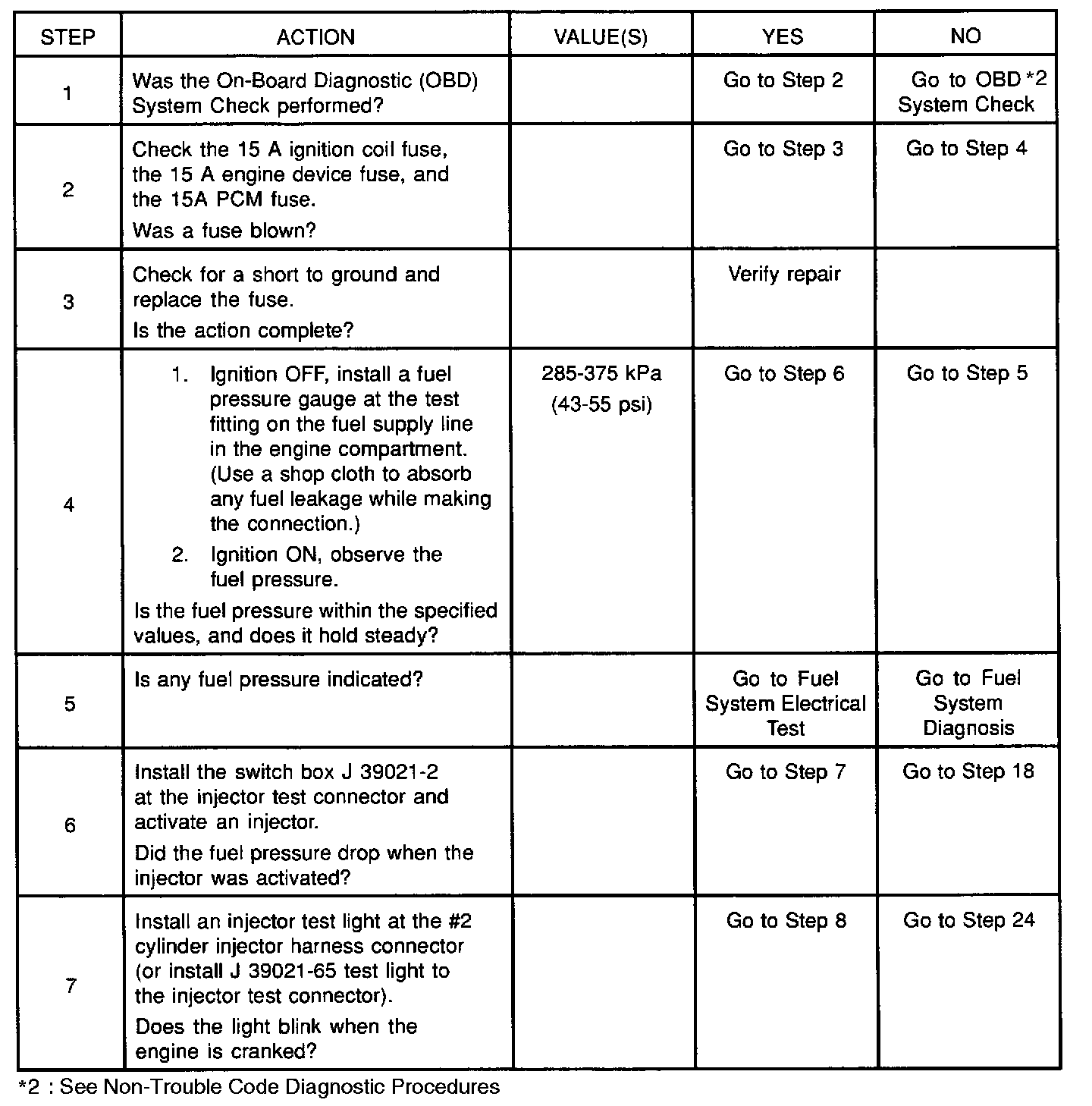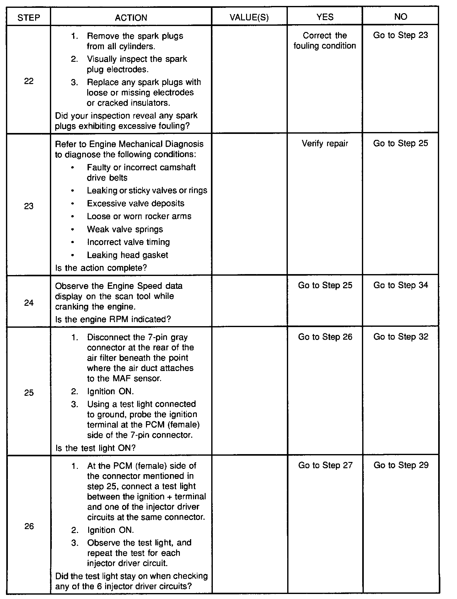 25. If there is an open or shorted driver circuit, DTCs 201-206 and a misfire DTC 301-306 should be set. All six injector driver circuits can be checked at one time without removing the intake manifold if a J 39021-95 test light is available. This is the alternative procedure: