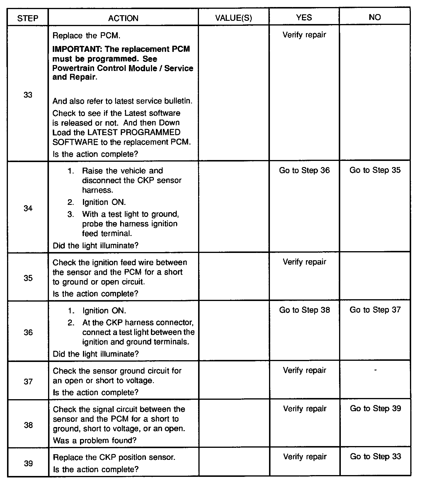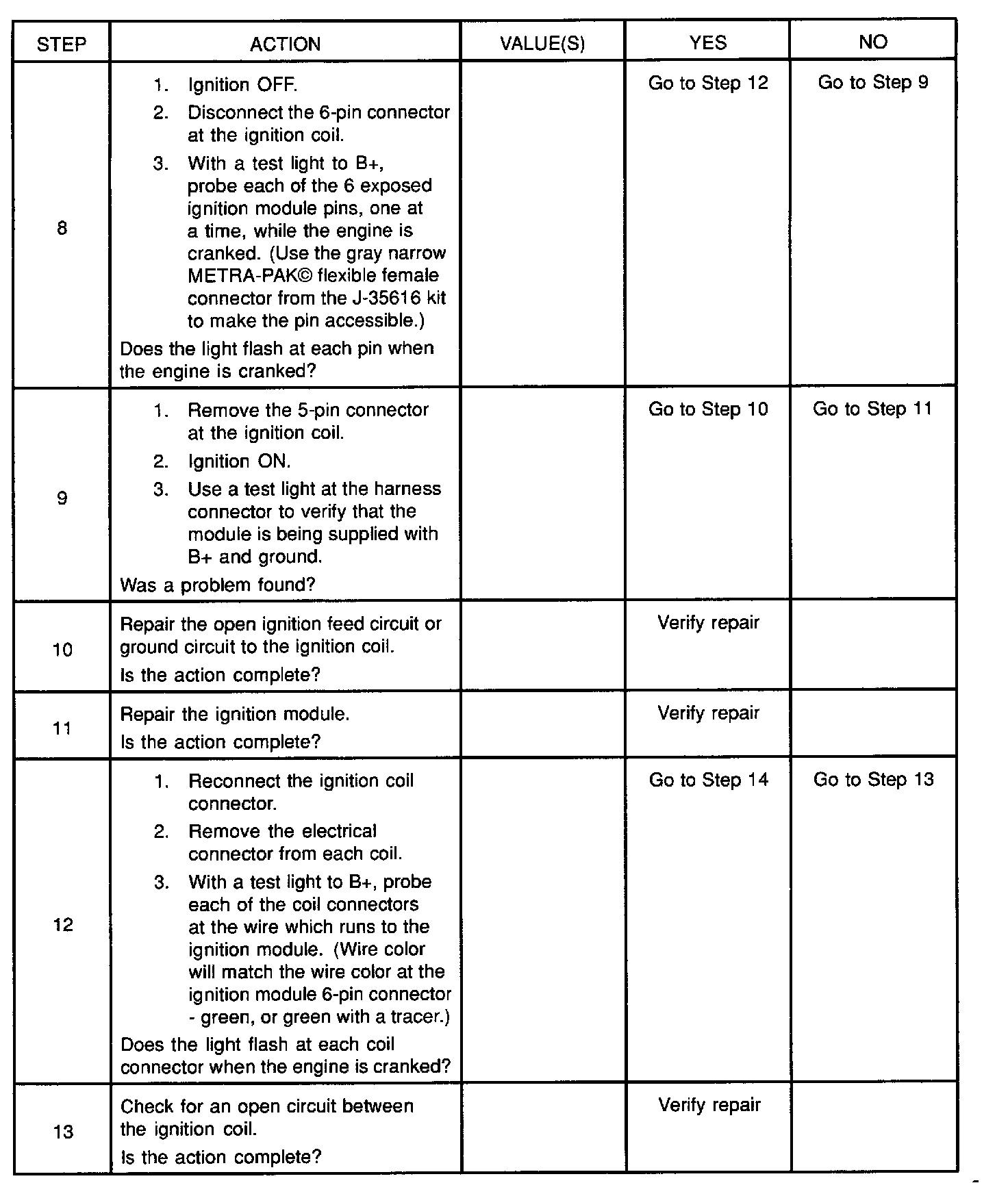 7. A blinking test light verifies that the PCM is monitoring the 58X crankshaft reference signal and is capable of activating the injectors. If there is an open or shorted driver circuit, DTCs 201-206 and a misfire DTC 301-306 should be set.