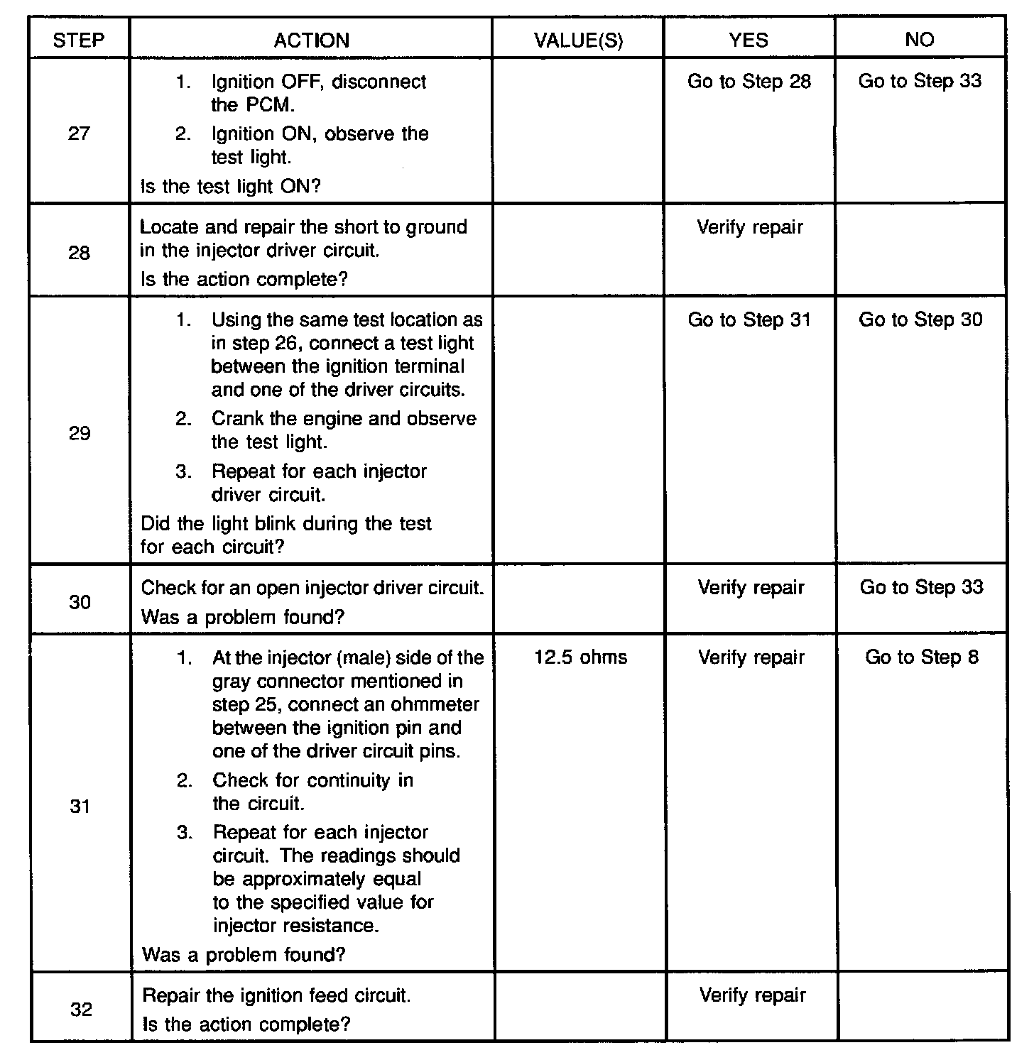 This procedure only tests the driver circuit as far as the test connection, so step 31 is added to test the circuit all the way to the injector.