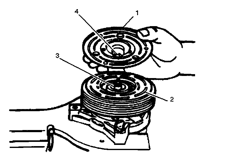 3. Align the shaft key (4) with the shaft keyway (3) and place the clutch plate and the hub assembly onto the compressor shaft.