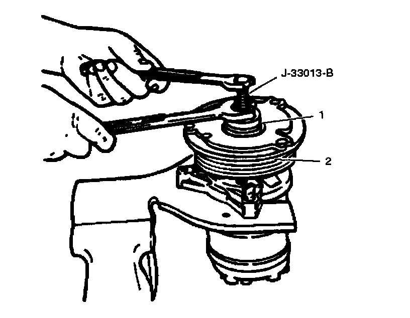 6. Hold the center screw with a wrench. Tighten the hex portion of the installer-remover J-33013-B body to press the hub onto the shaft. Tighten the body several turns, remove the installer and check to see that the shaft key is still in place in the keyway before installing the clutch plate and hub assembly to its finial position. The air gap (2) between frictional surfaces of the clutch plate and clutch rotor should be 0.50 - 0.76 mm (0.020 - 0.030 in).