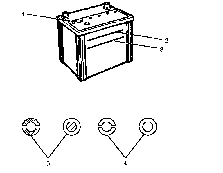 The fluid level should be between the upper level line(2) and lower level line(3) on side of battery.