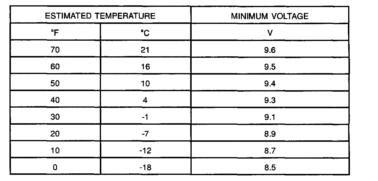 a. VOLTAGE DOES NOT DROP BELOW THE MINIMUM LISTED IN THE TABLE - The battery is good and should be returned to service.