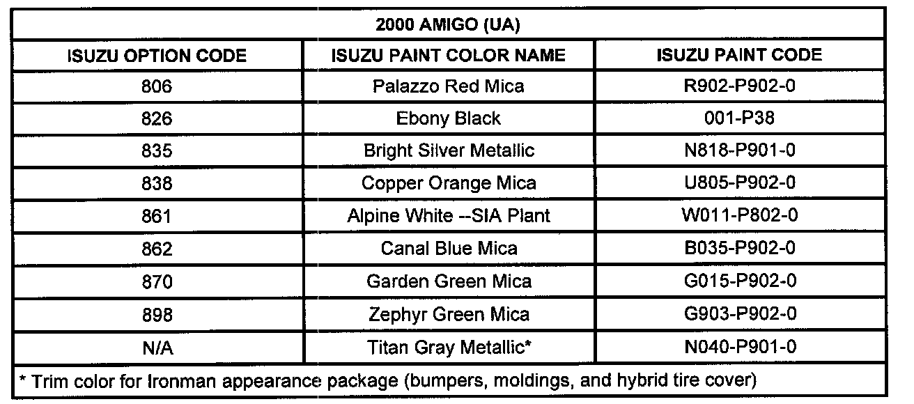 On the Amigo models, the 3-digit Isuzu option code is printed on the Service ID Information, mounted under the