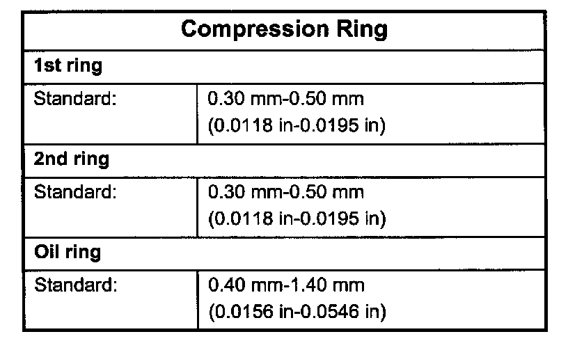2. Measure the clearance between the piston ring groove and the piston ring with a feeler gauge. If the piston ring groove / piston ring clearance exceeds the specified limit, the piston must be replaced.