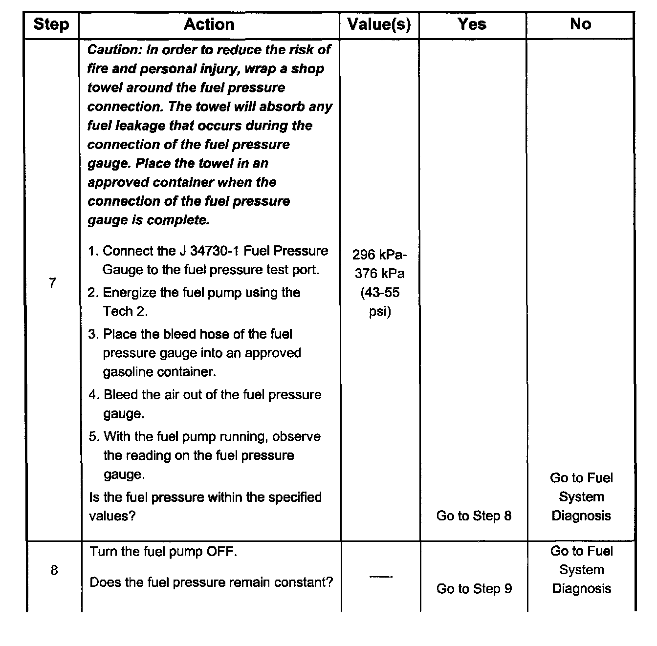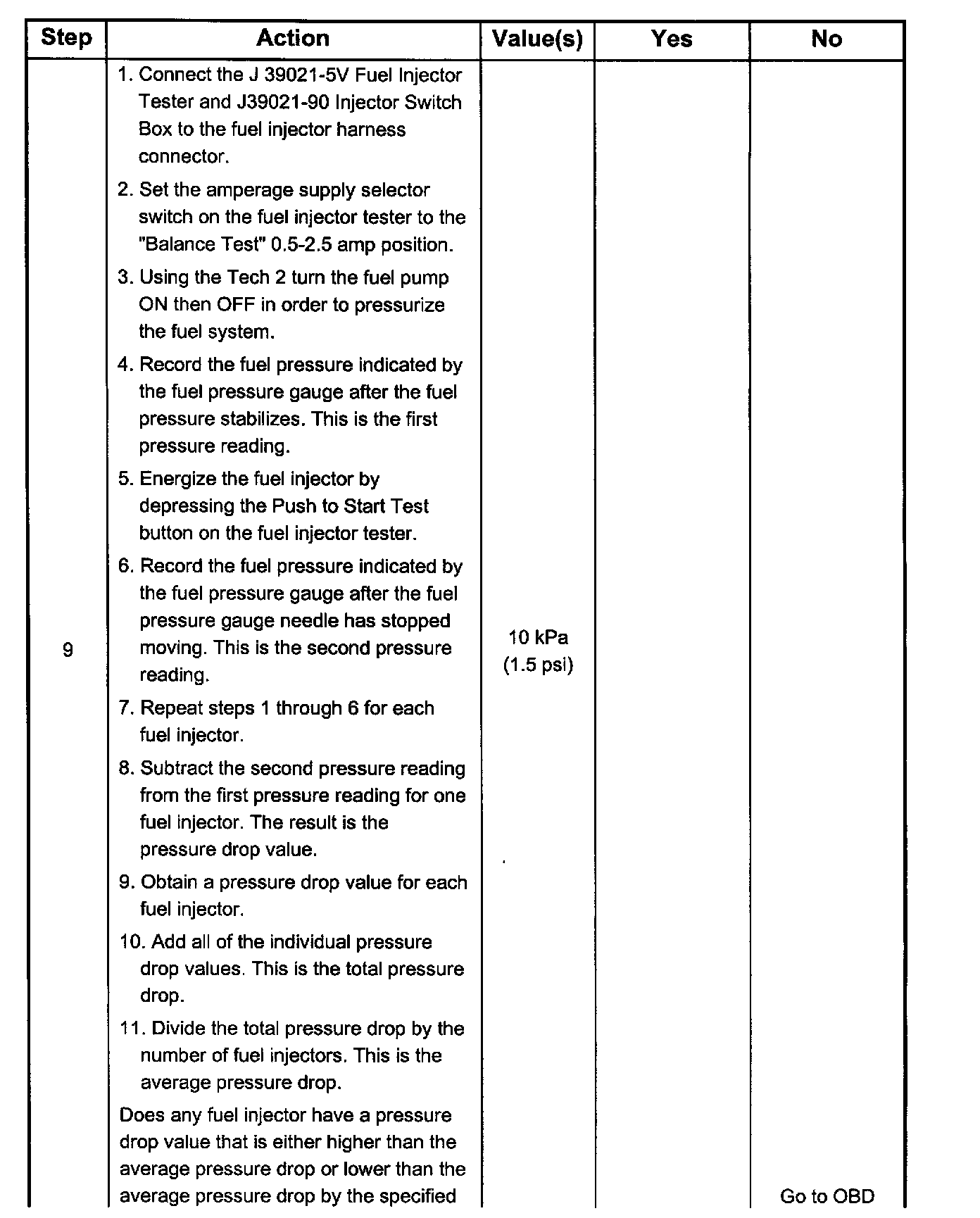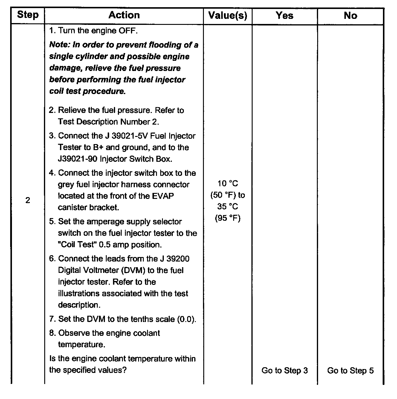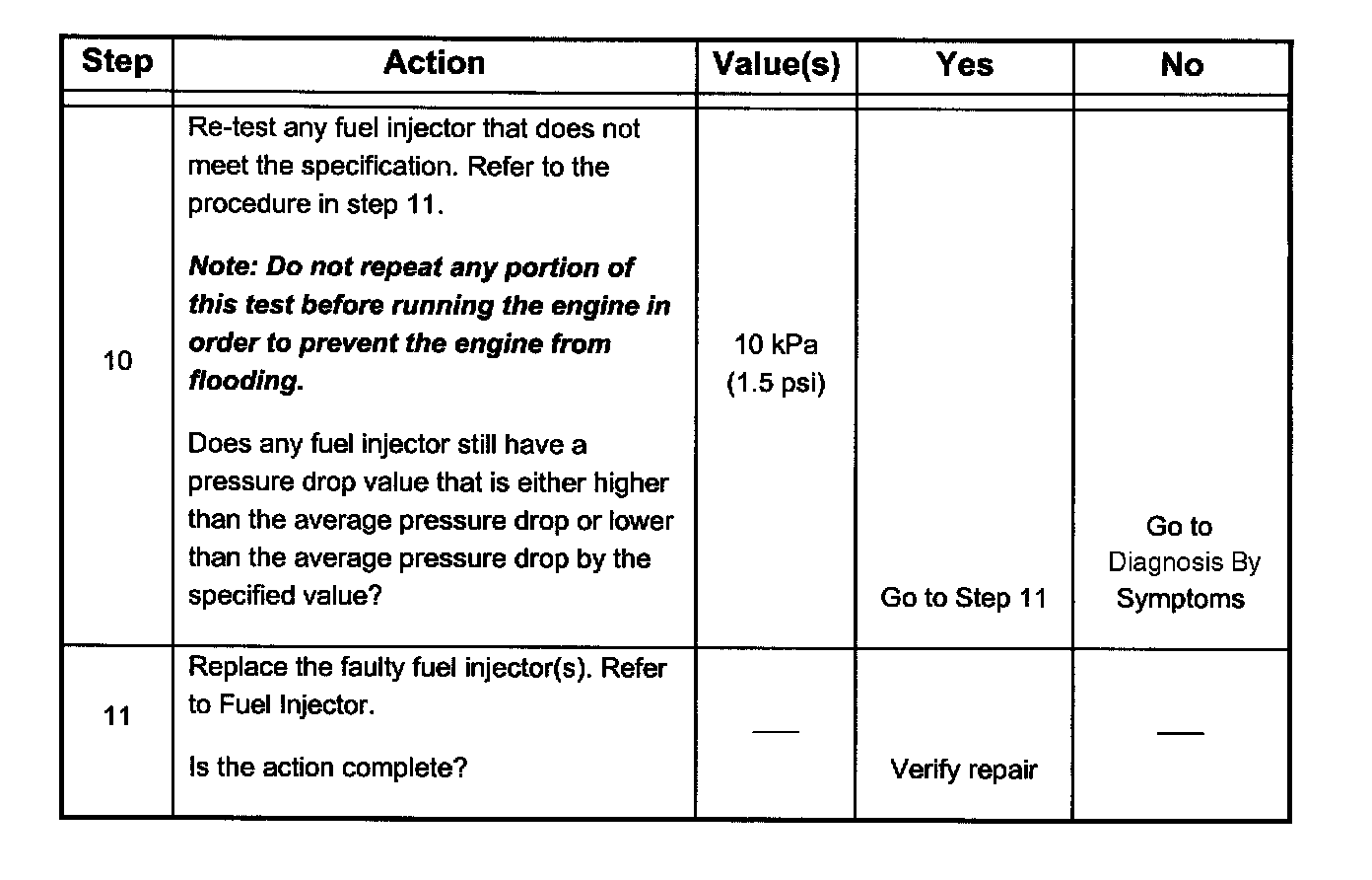 7. The Fuel Injector Balance Test portion of this chart (Step 7 through Step 11) checks the mechanical (fuel delivery) portion of the fuel injector. An engine cool-down period of 10 minutes is necessary in order to avoid irregular fuel pressure readings due to "Hot Soak" fuel boiling.