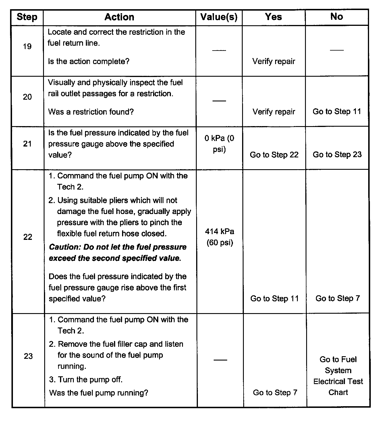 22. Restricting the fuel return line causes the fuel pressure to rise above the regulated fuel pressure. Command the fuel pump ON with the Tech 2. The fuel pressure should rise above 376 kPa (55 psi) as the fuel return line becomes partially closed.