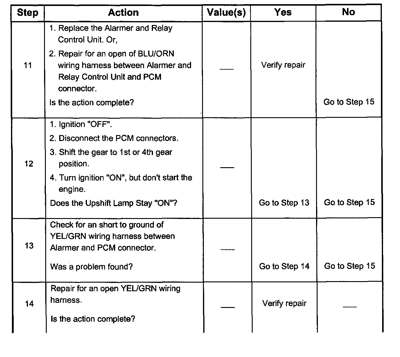 This should not turn "ON" the up-shift lamp. If the lamp is "ON", there is a short to ground in YEL/GRN or a fault PCM.