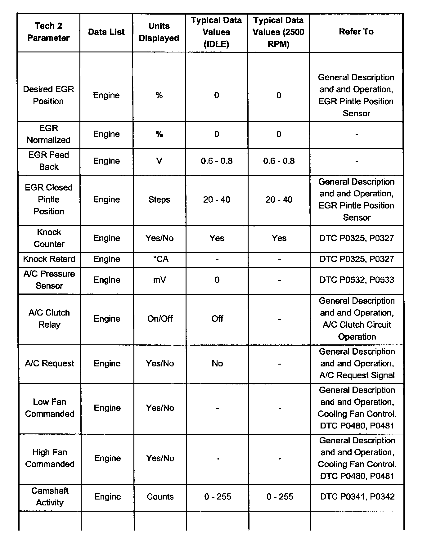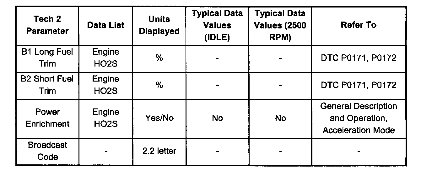 Typical Scan Data ValuesUse the Typical Scan Data Values Table only after the On-Board Diagnostic System Check has been completed, no DTC(s) were noted, and you have determined that the on-board diagnostics are functioning properly. Tech 2 values from a properly-running engine may be used for comparison with the engine you are diagnosing. The typical scan data values represent values that would be seen on a normally-running engine.