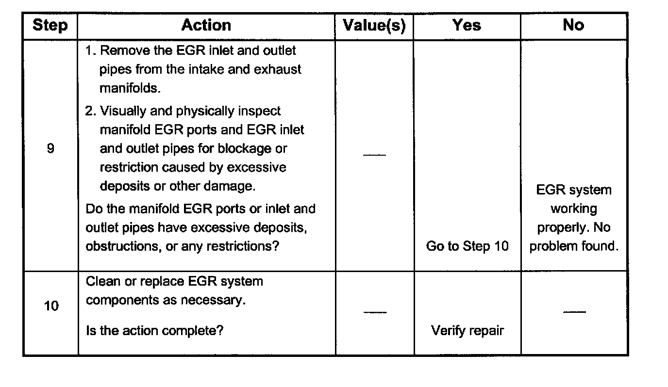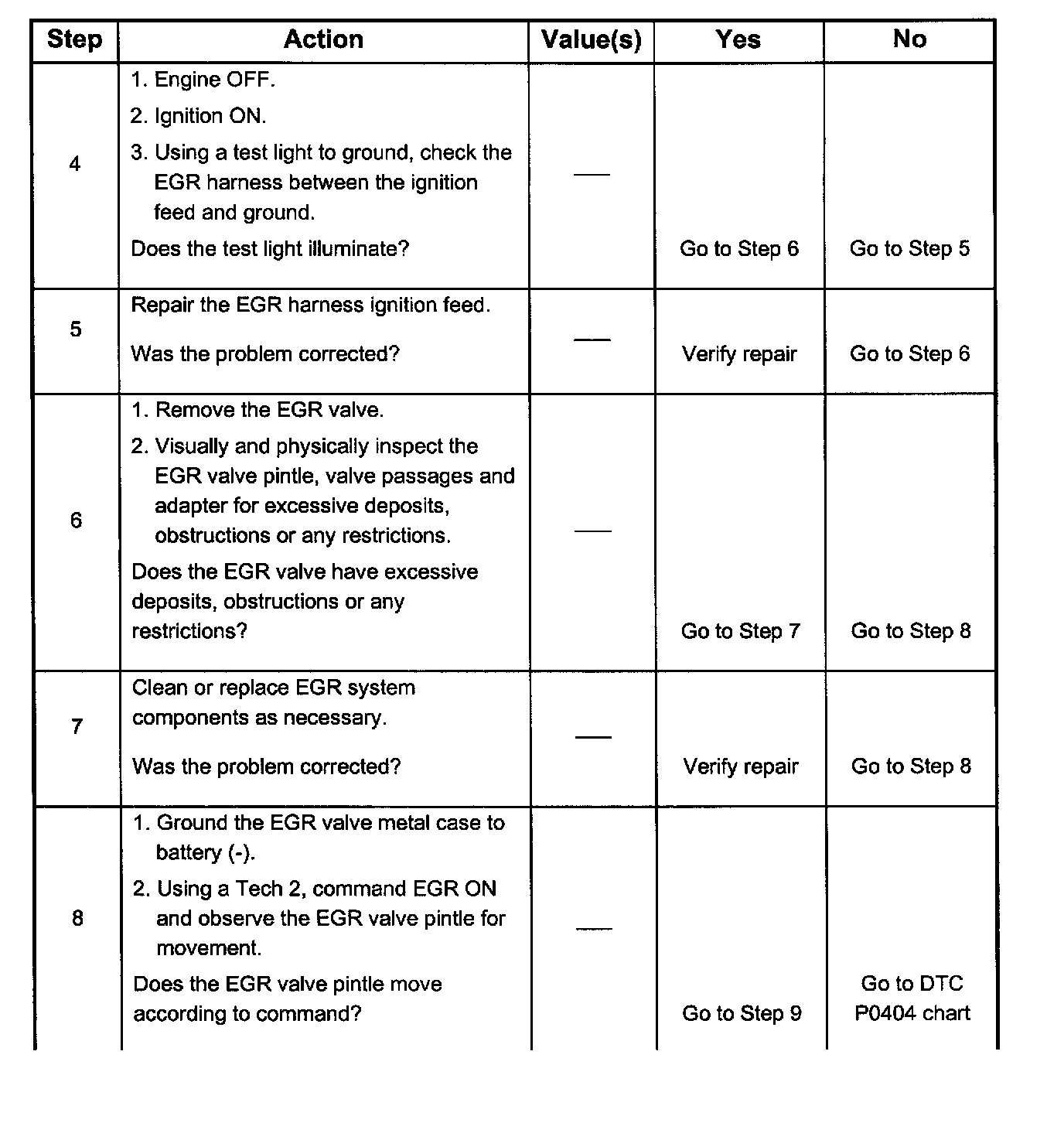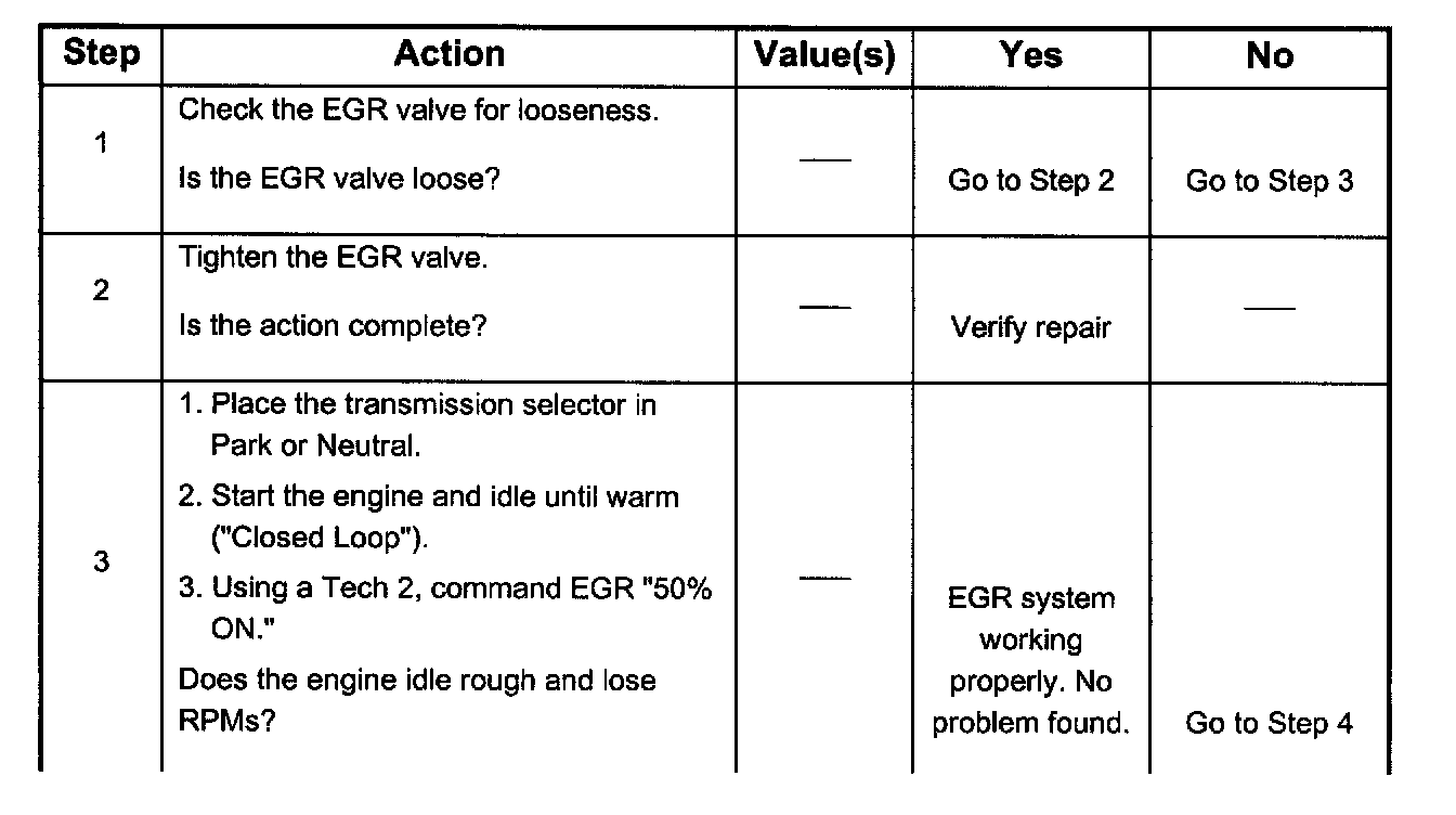 The EGR valve chart is a check of the EGR system. An EGR pintle constantly in the closed position could cause detonation and high emissions of NOx. It could also result in high long term fuel trim values in the open throttle cell, but not in the closed throttle cell. An EGR pintle constantly in the open position would cause rough idle. Also, an EGR valve mounted incorrectly (rotated 180 °) could cause a rough idle without setting an EGR DTC. Check for the following items: