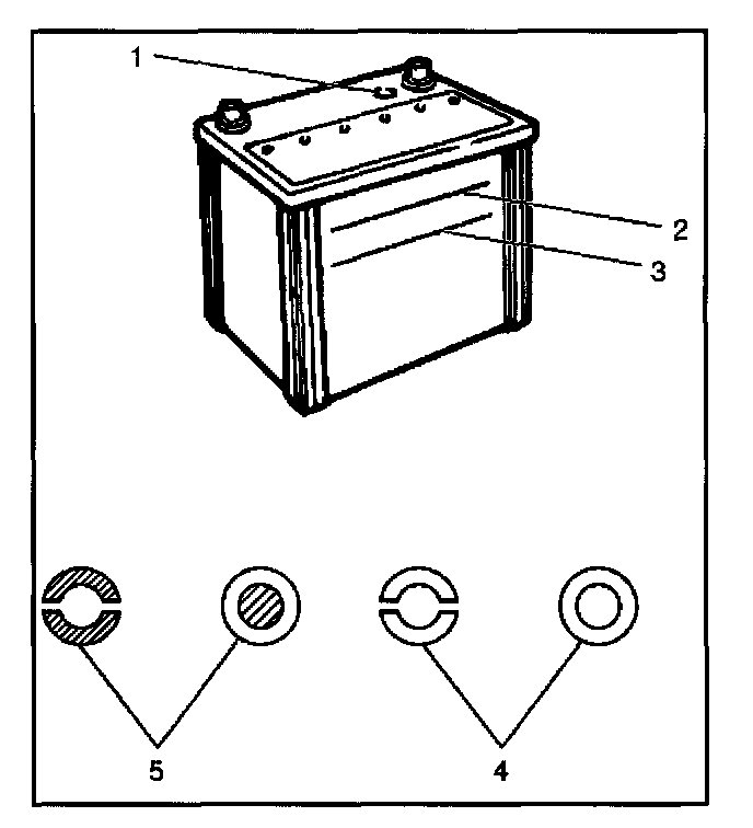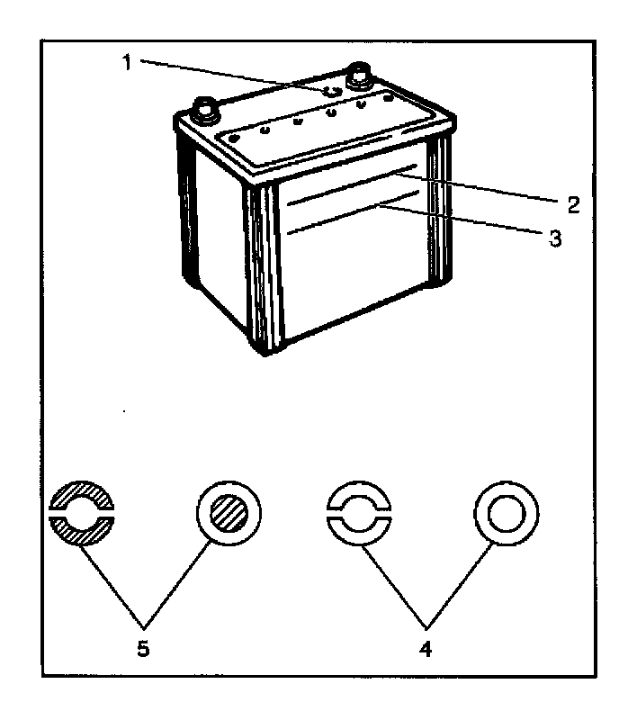 The fluid level should be between the upper level line (2) and lower level line (3) on side of battery.