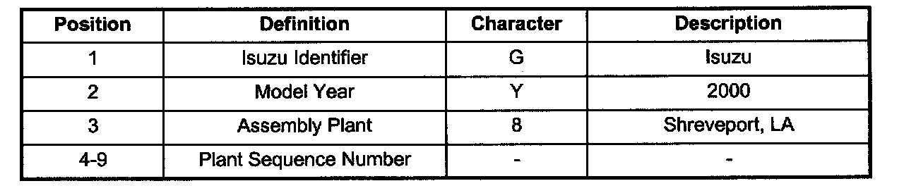 All engines and transmissions are stamped or laser etched with a partial Vehicle Identification Number (VIN), which was derived from the complete VIN. A VIN derivative contains the following nine positions: