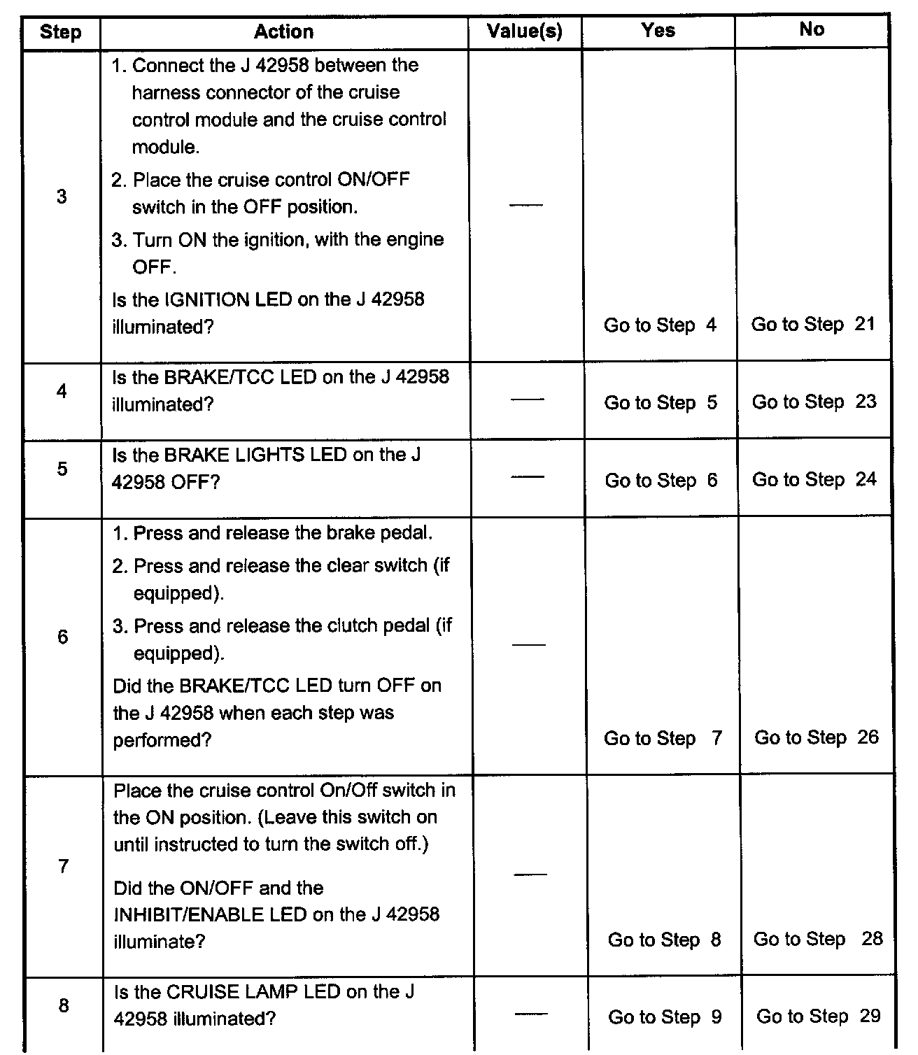 When this Tester is used on some vehicles with high resistance or an open in the cruise control module ground circuit, the Tester's LED(s) will light abnormally. For example, the Brake/Clutch and VSS LED(s) will light normally but the Ignition LED will be dim with the ON/OFF switch in the OFF position. However, with the ON/OFF switch in the ON position only the VSS LED will light. If the above situation occurs, please check the ground circuit before continuing with your diagnosis.