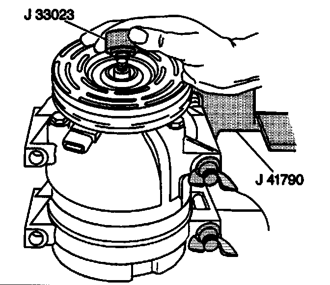 Make sure the clutch coil and the J 33024 stay in-line with each other while pressing the clutch coil onto the compressor.