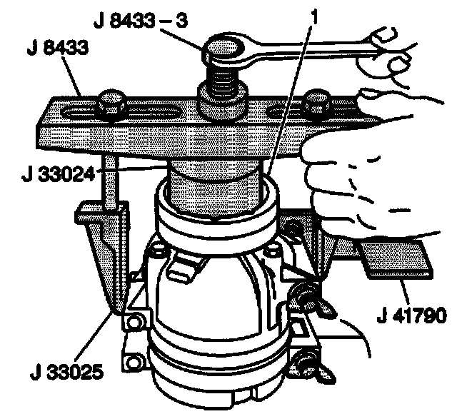 8. Install the J 8433 onto the compressor clutch coil (1) and tighten the puller leg bolts.