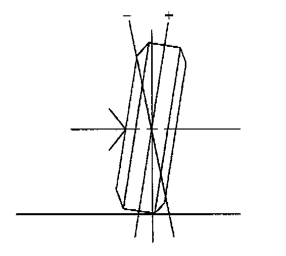 Camber is the tilting of the wheels from the vertical when viewed from the front of the vehicle. When the wheels tilt outward at the top, the camber is positive (+). When the wheel tilts inward at the top, the camber is negative (-). The amount of tilt is measured in degrees from the vertical. Camber settings influence the directional control and the tire wear.