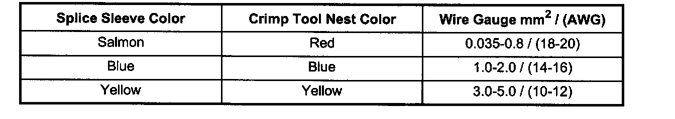 6. Select the proper sealed splice sleeve according to the wire size. Refer to the above table at the beginning of the repair procedure for the color coding of the splice sleeves and the crimp tool nests.