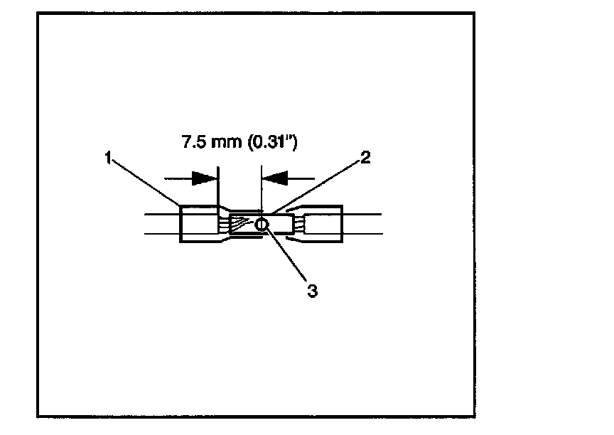 8. Place the splice sleeve in the nest. Ensure that the crimp falls midway between the end of the barrel and the stop. The sleeve has a stop (3) in the middle of the barrel (2) in order to prevent the wire (1) from going further. Close the hand crimper handles slightly in order to firmly hold the splice sleeve in the proper nest.