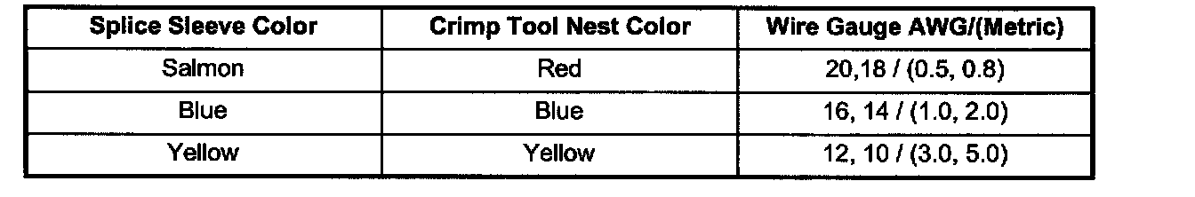 Use crimp and seal splice sleeves to form a one-to-one splice on all types of insulation except tefzel and coaxial to form a one-to-one splice. Use tefzel and coaxial where there is special requirements such as moisture sealing. Follow the instructions below in order to splice copper wire using crimp and seal splice sleeves.Crimp and Seal Splice Table: